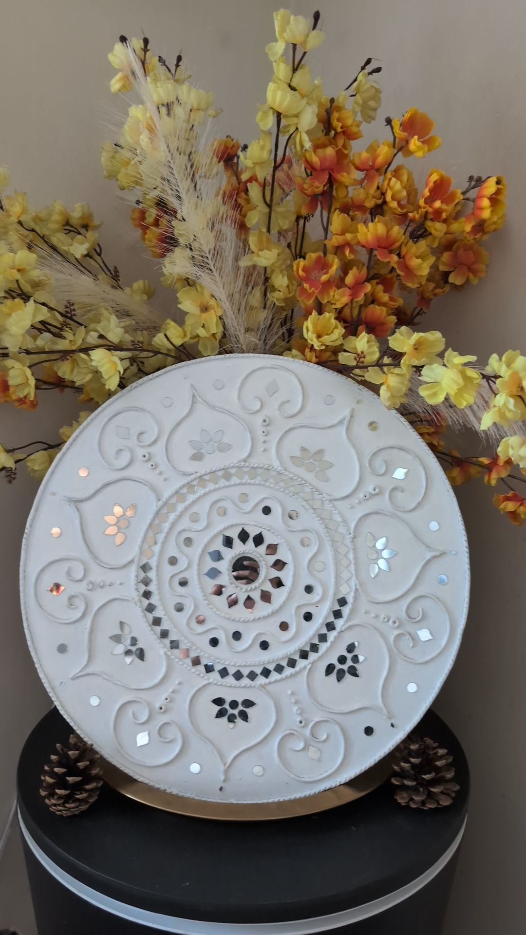 Created using traditional clay work and hand-placed mirror inlays, this round Lippan artwork carries the beauty of Kutchi heritage while embracing a soft, modern white aesthetic. The intricate floral and paisley carvings capture harmony and positivity, while each mirror reflects a gentle shimmer of light that instantly brightens any space.